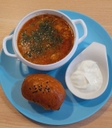 Український борщ, подається з хлібчиком, смальцем та сметанкою!