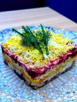 Ситний салат з філе оселедця, цибулі, моркви, картоплі, яєць, червоного буряка та майонезу.